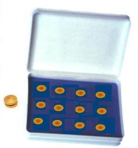 Aimants néodyme 5 mm Réf : AL9 Boite de 12 aimants néodyme contact cutané Champ au contact 800 Gauss par aimant Diamètre 5 mm Epaisseur 1,5 mm Revêtement Or 24 carats anti allergique Lavables à l'eau savonneuse ou à l'alcool Prix : 29,90 € Livrés avec notice détaillée et schémas d'emplacement des aimants